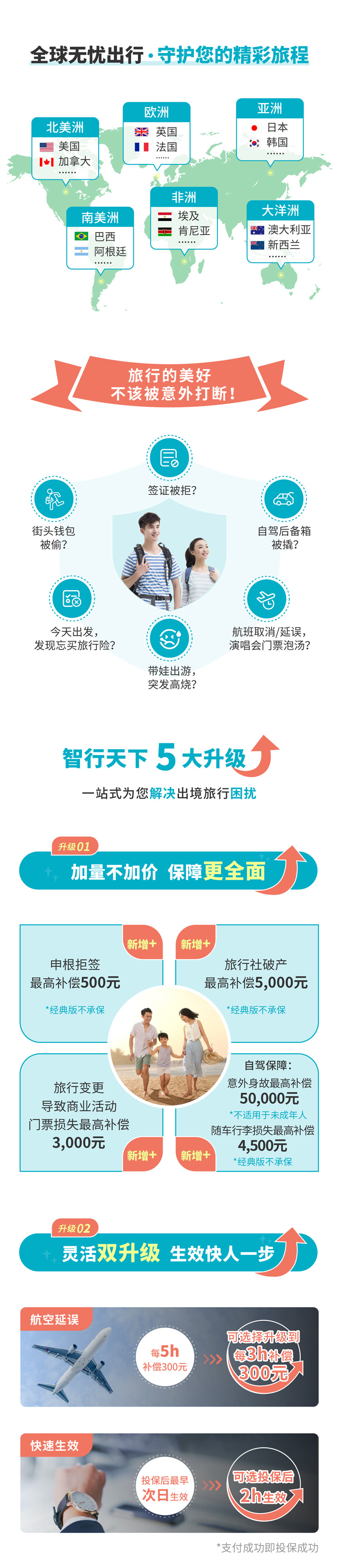 3.若投保人同时选择“旅行延误赔偿额调整为每3小时赔付300元”和“投保成功后两小时生效”,则该保单项下的旅行延误、行李延误、旅行变更及申根签证拒签的生效时间为投保成功后的次日。