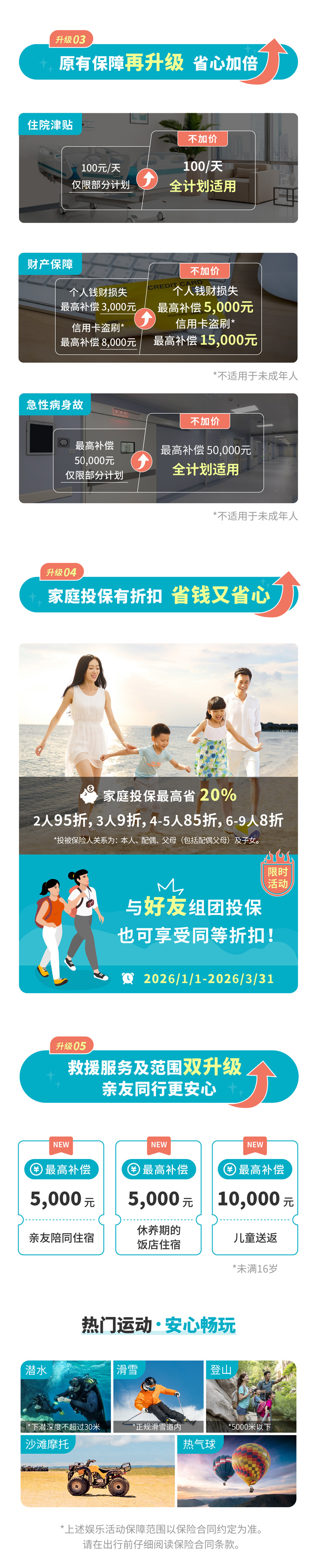 | 意外身故及残疾保险金(涵盖因参加热门娱乐活动发生的意外事故) | 200,000 | 300,000 | 600,000 | 1,000,000 |