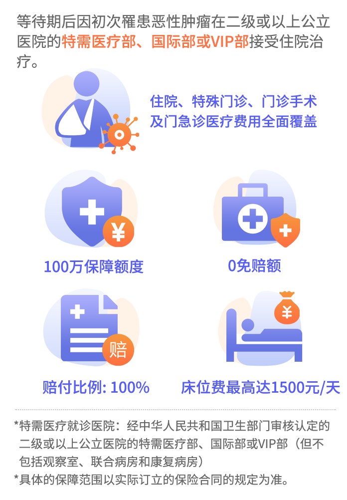 在保险期间内,被保险人在等待期后确诊初次罹患恶性肿瘤在二级或以上公立医院的特需医疗部、国际部或VIP部(不包括观察室、联合病房和康复病房)接受治疗的,本保险承担必需且合理的住院医疗费用、特殊门诊医疗费用、门诊手术医疗费用及住院前后门急诊医疗费用(限被保险人在住院前7日和出院后30日内的门急诊医疗费用),其中床位费限1500元/天