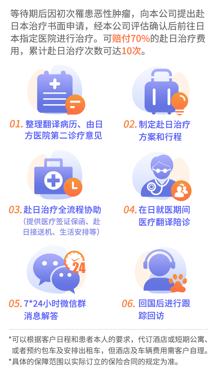 在保险期间内,被保险人在等待期后确诊初次罹患恶性肿瘤,向本公司提出赴日本治疗书面申请,经本公司评估确认后前往日本指定医院进行治疗的(累计赴日治疗次数限10次),本保险按照70%的给付比例承担被保险人在日本接受恶性肿瘤治疗期间所发生的必需且合理的医疗费用,包括诊疗费、治疗费、床位费、膳食费、护理费、检查检验费、药品费、手术费等。