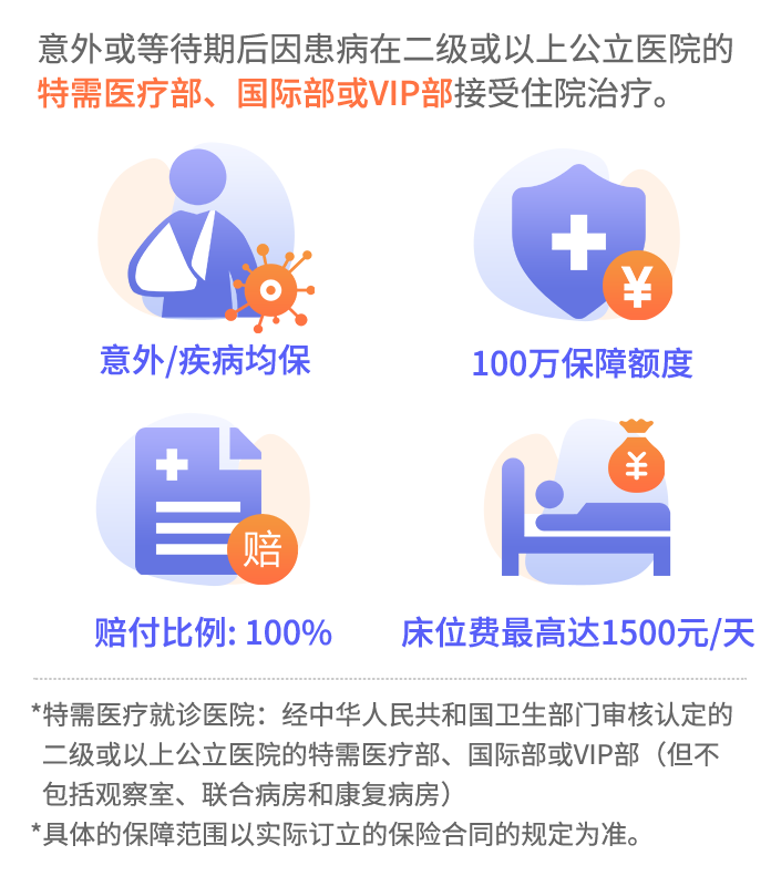 在保险期间内,被保险人因遭受意外伤害事故或在等待期后因患疾病在二级或以上公立医院的特需医疗部、国际部或VIP部(不包括观察室、联合病房和康复病房)接受治疗的,本保险承担必需且合理的住院医疗费用,其中床位费限1500元/天